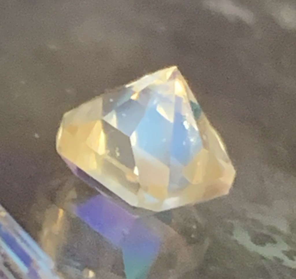 Find out how the angle of the optical effect is coordinated in the stone so the only light source is parallel with the eye. In other words, start with a light directly above your head and the stone. Your eyesight and the light need to be perpendicular to the stone so you can determine the angles. Where things get difficult, the second cleavage plane is 90 degrees to the first, but this can be in two different directions within the stone; north-south to you or east-west to the plane. There’s not really much, as far as my experience goes, in figuring out how to best find these secondary angles without the optical effects highlighting the planes.